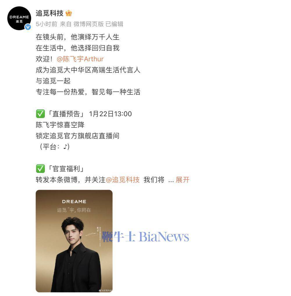 1月22日,追觅科技精雅官宣演员陈飞宇担任其大中华区高端生计代言东说念主,并同步预热直播动作。