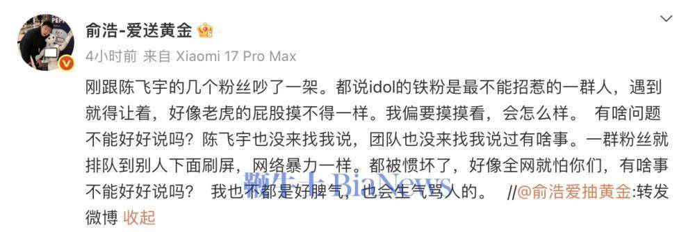 据悉,俞浩微博褒贬区被陈飞宇粉丝刷屏。