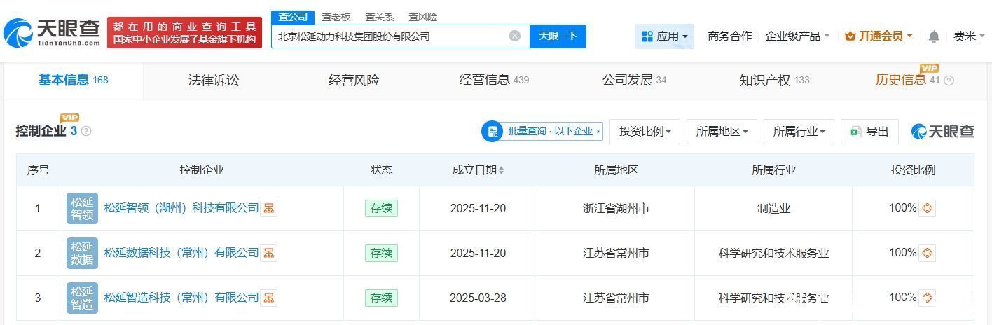 天眼查工商信息披露,北京松延能源科技集团股份有限公司诞生于2023年9月,法定代表东说念主为姜哲源,注册老本约325万东说念主民币,蓄意边界包括工业机器东说念主销售、智能机器东说念主的研发、智能机器东说念主销售等。鼓励信息披露,该公司由姜哲源、北京松延伙伴处分筹备做事搭伙企业(有限搭伙)、北京松延致同处分筹备做事搭伙企业(有限搭伙)等共同抓股。为止企业信息披露,旧年,该公司诞生了松延智领(湖州)科技有限公司、松延数据科技(常州)有限公司、松延智造科技(常州)有限公司。变更记载信息披露,本年2月,该公司企业称呼由松延能源(北京)科技有限公司变更为北京松延能源科技集团股份有限公司,此外,该公司旧年屡次发生增资。