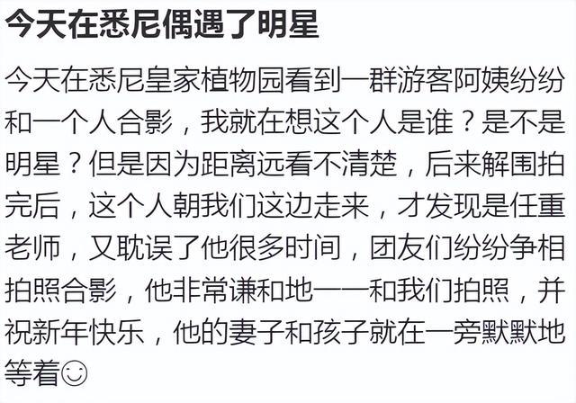 3月10日,有多位网友共享出在澳洲悉尼偶遭受演员任重动态。与家东说念主度假的任重虽说是私东说念主行程,但被认出后的他甘心清爽合影条件,还被网友夸赞本东说念主极端虚心有亲和力。