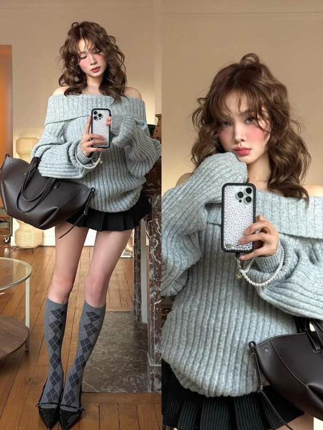 个子工整,长相甜好意思,相同也不错选拔灰色的一字肩竭诚上衣,配上压褶短裙,脚上穿的一对玄色的低跟单鞋,穿上灰色的中筒袜,这样下衣失散穿法照实显得很俏皮。