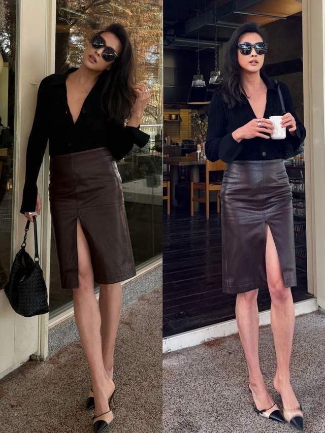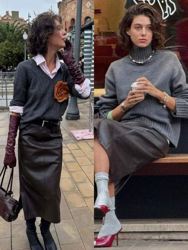 长相偏进修,高个子女性可选玄色竭诚开衫配上棕色皮质开叉半裙,这条直筒半裙长度无意盖过膝盖,作念了开叉的贪图,更容易呈现大长腿的上风,气场都备。