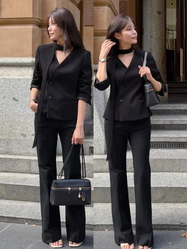 如果上班时穿搭,咱们也不错选拔玄色的 V 领西服,配上玄色西装直筒裤,脚上衣服一对高跟凉鞋,这样的打扮既千里稳又干练,不外很认真体魄与衣服的面料,面料挺括有型有明后感,上死后果才不会显得低价。