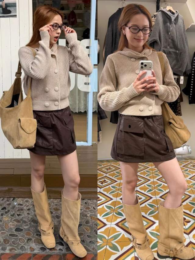 个子工整,长相甜好意思,不错选一件竭诚毛衣开衫,搭配上棕色的工装短裙,脚上穿的地面色系的中筒靴,这样的穿衣作风甜而不腻,又带来那么少许酷感。
