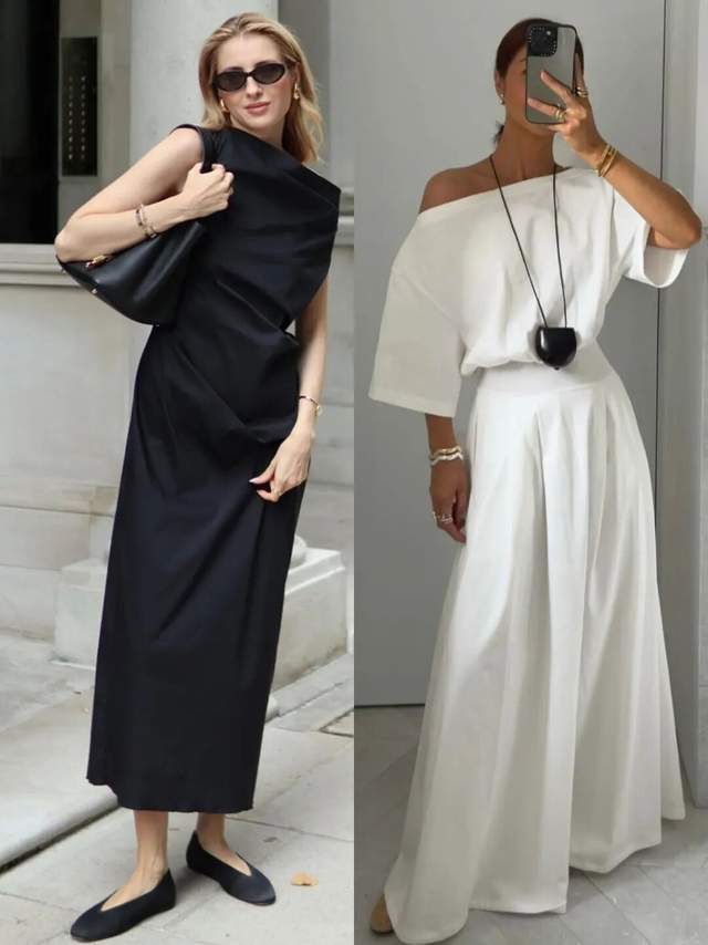 或是选拔斜肩的玄色上衣,配上玄色直筒开叉半裙,脚上穿的玄色东说念主字拖,符合的清晰肩颈、锁骨的肌肤,显得更灵动,既优雅又洋气。